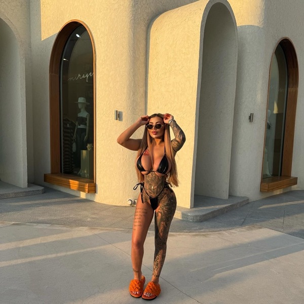 | Körperschmuck: | Zungen-Piercing, Tattoos, Nabel-Piercing |