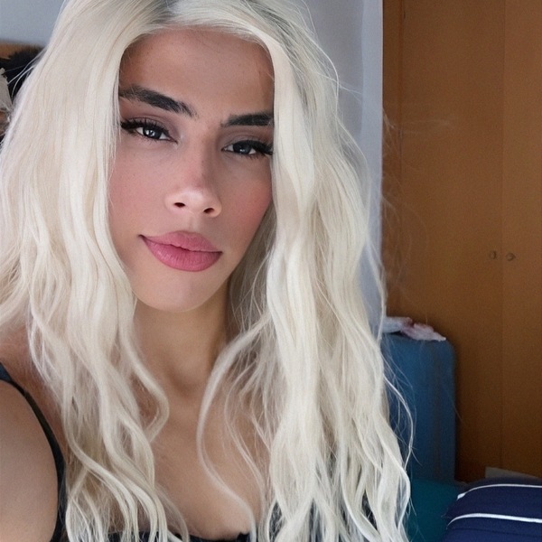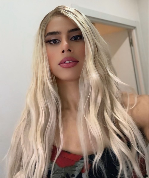 Haare:dunkelblond, rückenlang, glatt